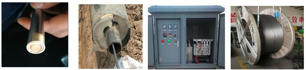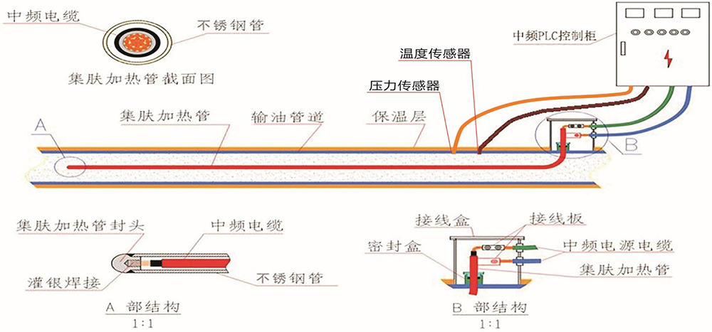 集輸管道電加熱裝置的基本構(gòu)成:中頻測控柜、PLC集成控制系統(tǒng)、特種不銹鋼管加熱線纜、無線傳輸模塊、溫度傳感器、壓力傳感器、接線盒、密封組件等。